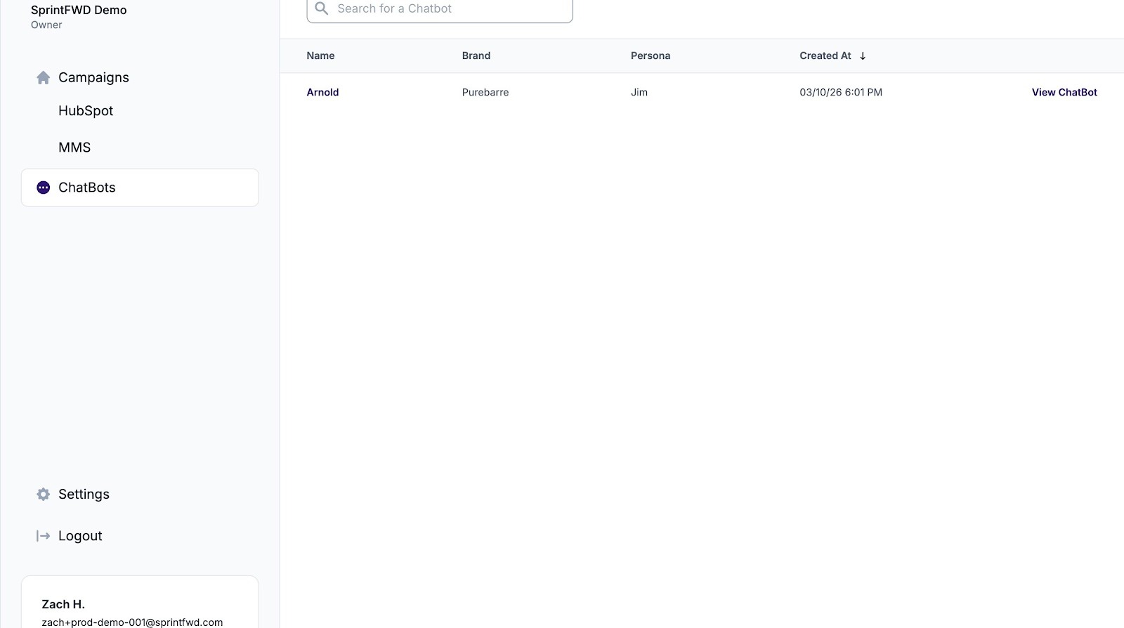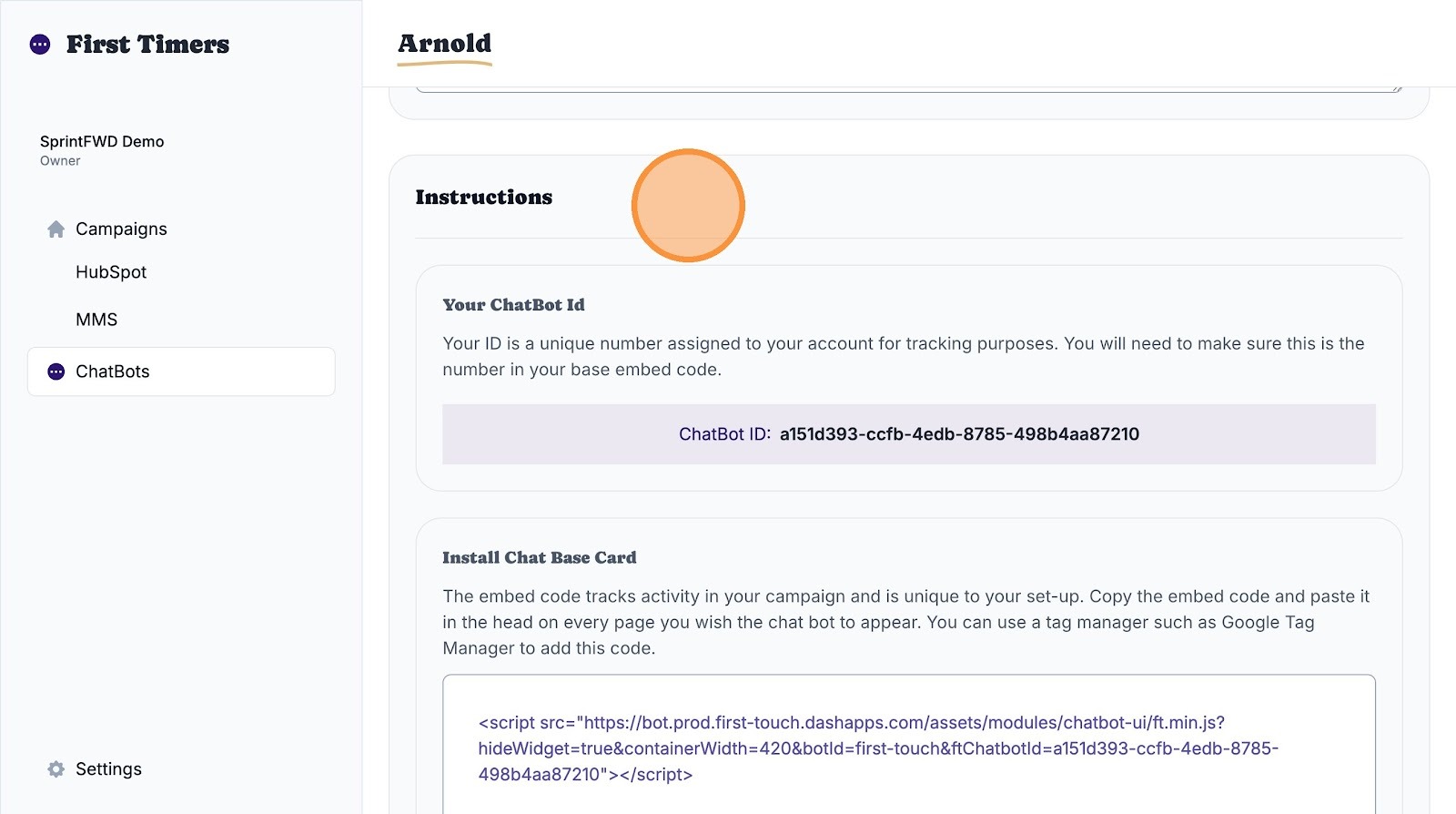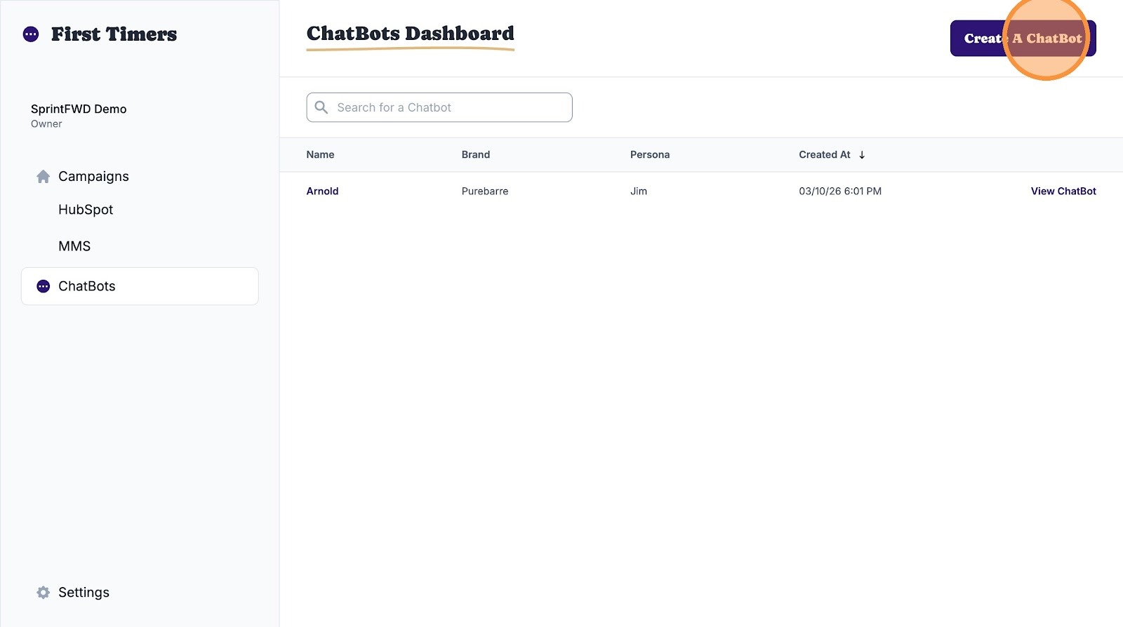 1. Navigate to your First Timers dashboard and click "ChatBots"