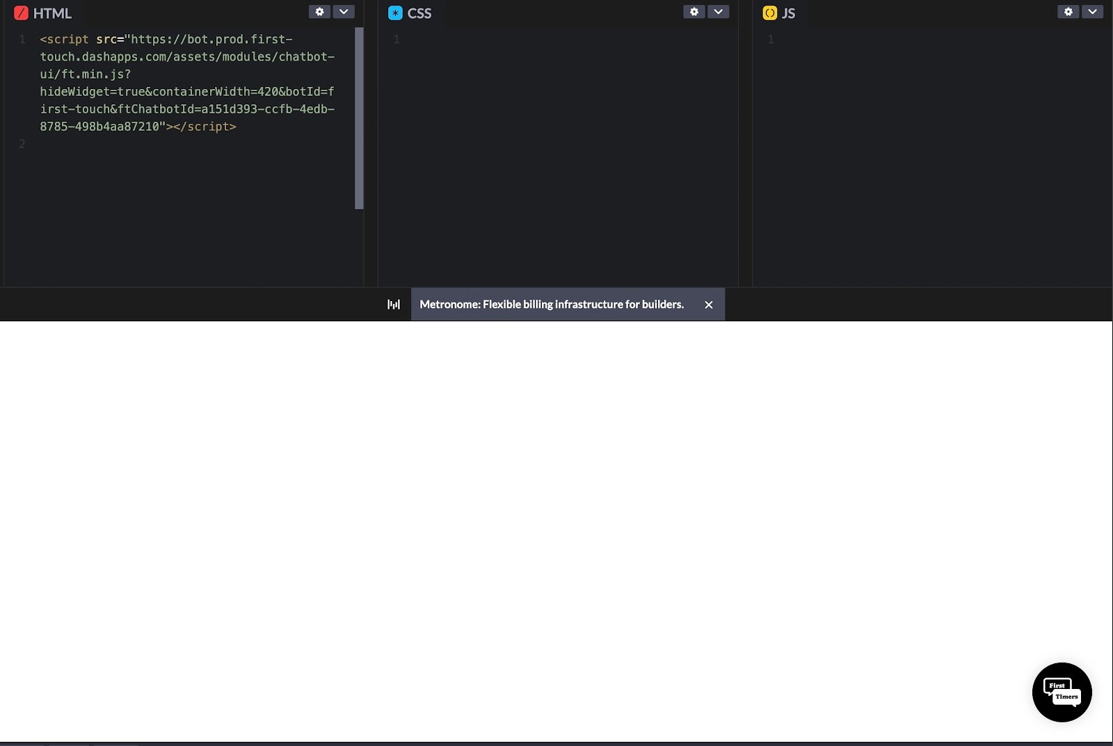 6. Copy the embed code and paste it in the head on every page you wish the chat bot to appear. You can use a tag manager such as Google Tag Manager to add this code (note: below a dummy site is used via codepen.io.)